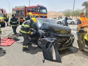 תאונת דרכים בכניסה לאזור התעשייה שחורת באילת. 4 אנשים נפצעו באורח קל ובינוני, בתאונה היו מעורבים 3 כלי רכב. באחד הרכבים היתה לכודה שחולצה על ידי צוותי הכיבוי אש אילת תוך שימוש בכלים הידראוליים ובשיתוף פעולה עם גורמי רפואה שנכחו במקום.