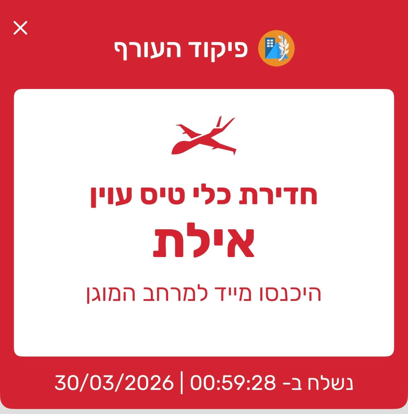 אזעקה הופעלה בעיר אילת בעקבות חדירת כלי טיס עוין. מערכת כיפת ברזל הץביצעה ירוט נוסף.